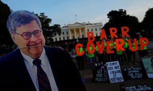 A cardboard cutout of US attorney general William Barr is seen as protesters hold signs outside the White House. Photograph: Carlos BarrĂa/Reuters