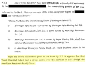 Investigators concluded: “From the above information given to the bank by EIF, it appears that Vinod Adani had a direct control over the activities of EIF through the Asankhya Resources Family Trust.”