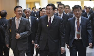 Lou Jiwei, centre, arrives for a G20 finance ministers’ and central bank governors’ meeting at the IMF on 15 April. Photograph: Mandel Ngan/AFP/Getty Images