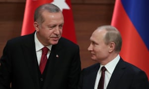 Presidents Tayyip Erdoğan of Turkey and Vladimir Putin of Russia in Ankara. Photograph: Reuters