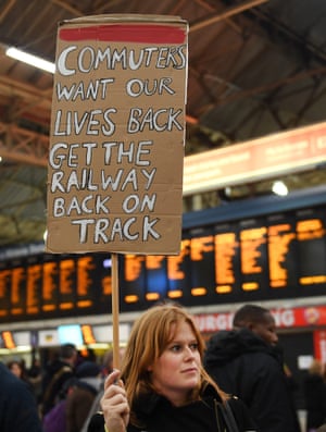 A commuter protests in support of Southern Rail staff. at Victoria Station in London. Photograph: Andy Rain/EPA