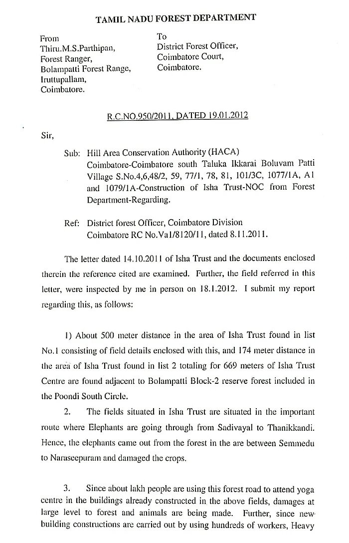 Isha did apply for approval from HACA in 2011, but after they had already built several structures. In July 2011, a forest department document shows, Isha asked HACA to greenlight illegal constructions on 63,380 sq meters as well as new constructions on 28582.52 sq metres. Taking up the application, V Thirunavukkarasu, then Coimbatore’s forest officer, visited the Isha ashram in February 2012. He found Isha had illegally constructed a series of buildings, including on the 28,582.52 sq meter plot for which it had gone to HACA for approval.
