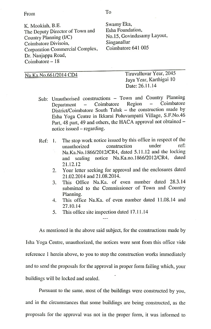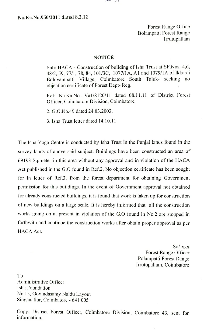 Isha breached the deadline and only sent a new application seven months later. Subsequently, when planning officials visited the ashram in October 2012 they found construction of the new buildings had already begun. They ordered the foundation to immediately stop all construction and followed up with a notice in November 2012. Isha didn’t care.