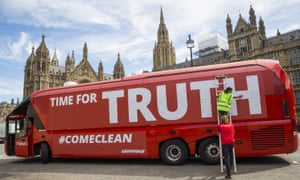 A Vote Leave battle bus, rebranded outside parliament in London by Greenpeace last month. Photograph: Jack Taylor/Getty Images
