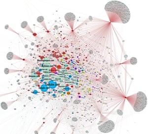 He found 23,000 pages and 1.3m hyperlinks. “And Facebook is just the amplification device. When you look at it in 3D, it actually looks like a virus. And Facebook was just one of the hosts for the virus that helps it spread faster. You can see the New York Times in there and the Washington Post and then you can see how there’s a vast, vast network surrounding them. The best way of describing it is as an ecosystem. This really goes way beyond individual sites or individual stories. What this map shows is the distribution network and you can see that it’s surrounding and actually choking the mainstream news ecosystem.”