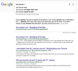 Google is knowledge. It’s where you go to find things out. And evil Jews are just the start of it. There are also evil women. I didn’t go looking for them either. This is what I type: “a-r-e w-o-m-e-n”. And Google offers me just two choices, the first of which is: “Are women evil?” I press return. Yes, they are. Every one of the 10 results “confirms” that they are, including the top one, from a site called sheddingoftheego.com, which is boxed out and highlighted: “Every woman has some degree of prostitute in her. Every woman has a little evil in her… Women don’t love men, they love what they can do for them. It is within reason to say women feel attraction but they cannot love men.”