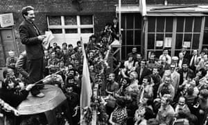 Lech Wałęsa speaks to workers during a strike at the Gdańsk shipyard in 1980. Photograph: Erazm Ciołek/Forum/Reuters